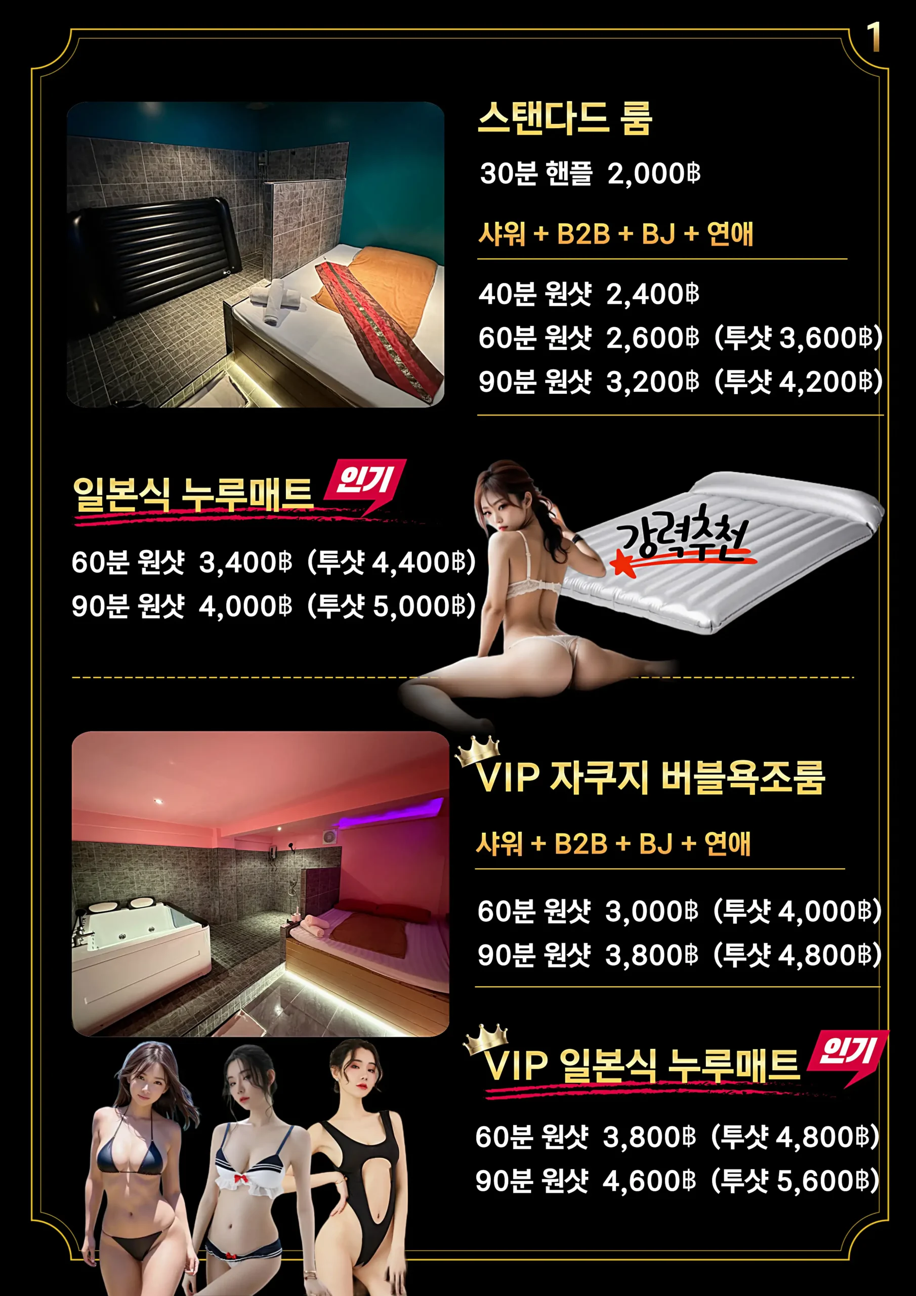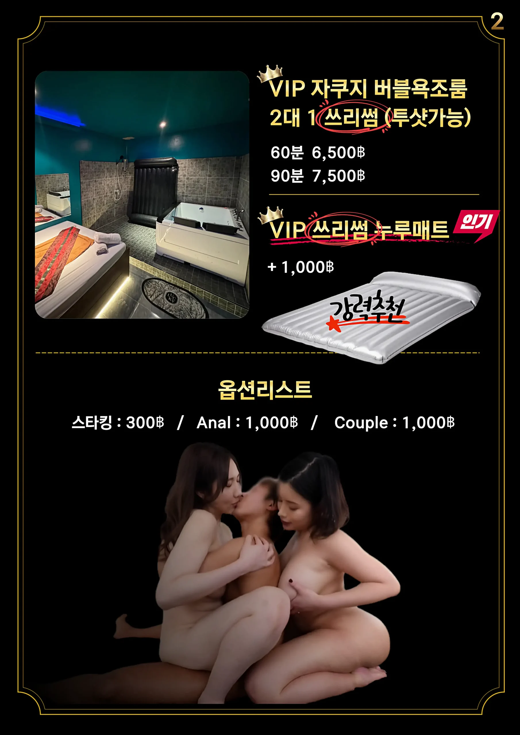시간과 예산에 여유가 있으시다면 VIP 일본식 90분 코스 (4,600바트) 또는 VIP 자쿠지룸 60분 투샷 코스 (4,000바트) 를 추천드립니다. 자쿠지에서의 특별한 경험이 더해져 만족도가 훨씬 높습니다.